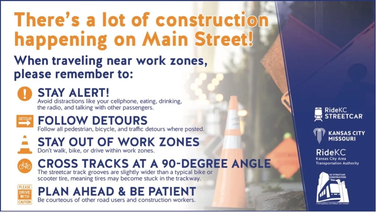 Thank you for staying safe in the KC Streetcar Main Street Extension work zone by staying alert, minimizing distractions, following posted detours, and staying out of active work zones. Plan ahead, be patient, and be courteous of other road users and construction workers!